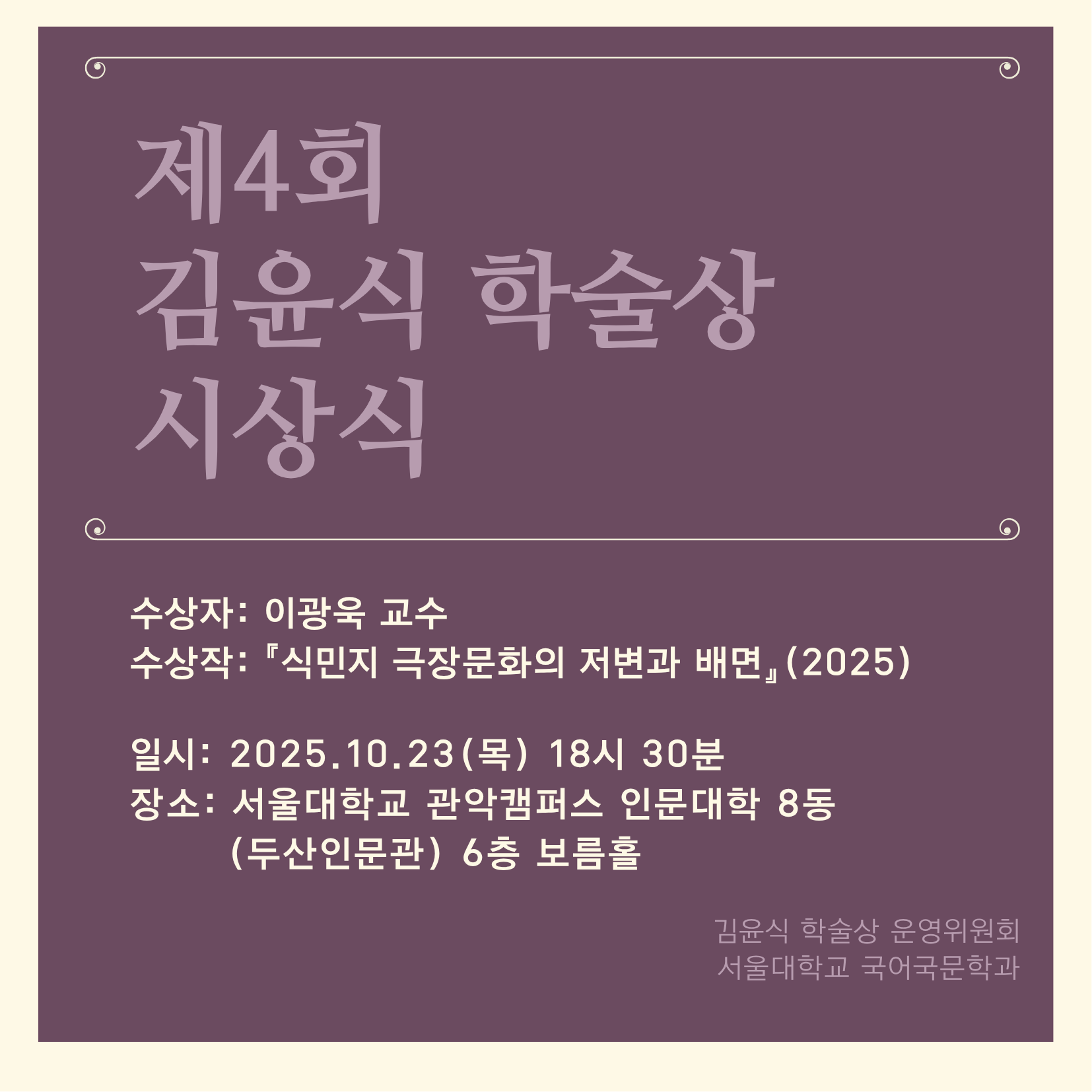 김윤식 학술상은 가정혜 선생님의 기금 출연에 힘입어 고 김윤식 선생님의 학문적 업적과 정신을 기리고, 한국현대문학 연구의 정신을 진작하기 위해 2022년 9월에 제정되었습니다. 김윤식 학술상 운영위원회의 위촉을 받은 심사위원회는 제4회 김윤식 학술상 수상자로 『식민지 극장문화의 저변과 배면』(2025)을 펴낸 이광욱 선생님을 선정하였습니다. 부디 귀한 시간을 내주시어 수상자에게 축하와 격려를 보내주시면 진심으로 감사하겠습니다.